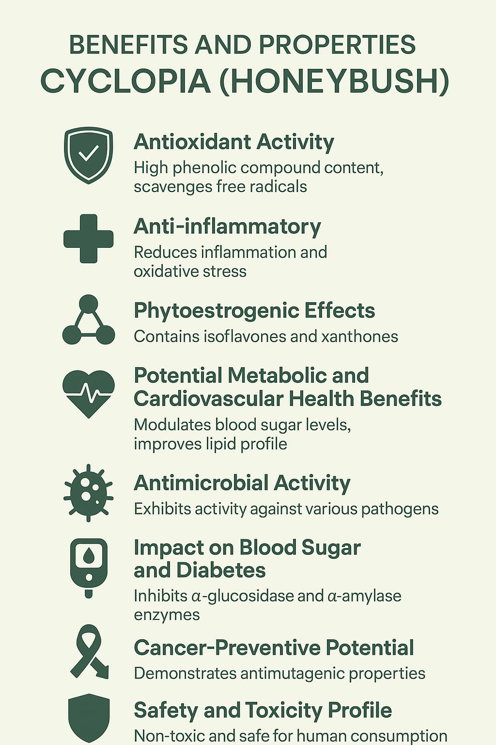 These compounds together in honeybush are being tested for their potent anti-cancer effects, skin photoprotection, anti-obesity and anti-diabetic properties.